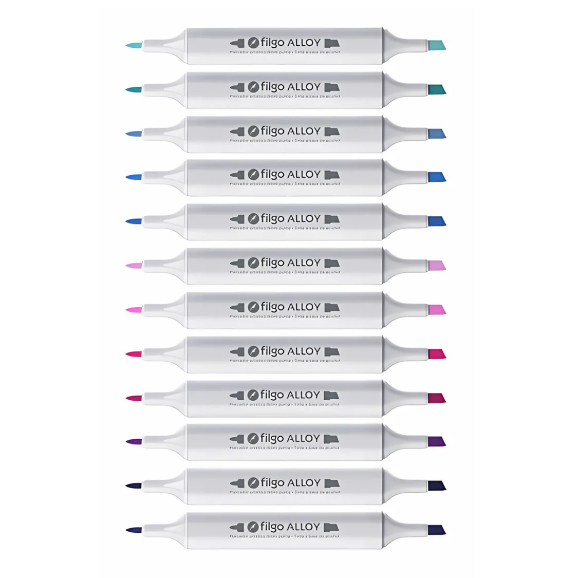 Los Marcadores Filgo en su línea Alloy se encuentran disponibles en 6 sets diferentes. El Set de Tonos Fríos contiene los siguientes colores: Esmeralda, Turquesa, Cyan, Agua, Azul persa, Ultramarino, Zafiro, Amatista, Fucsia, Rubí, Chicle y Lavanda. *Nota: La presentación del producto podría cambiar.